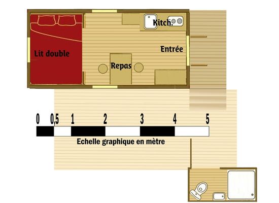 Pensée pour un séjour à deux, elle offre un espace cosy avec un lit double, une kitchenette et un coin repas, dans une ambiance chaleureuse où le bois est à l’honneur.