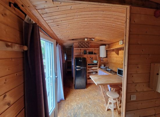 Cet hébergement insolite pour 2 personnes propose un espace cosy avec un lit double, une kitchenette et un coin repas pour profiter simplement de vos moments ensemble.